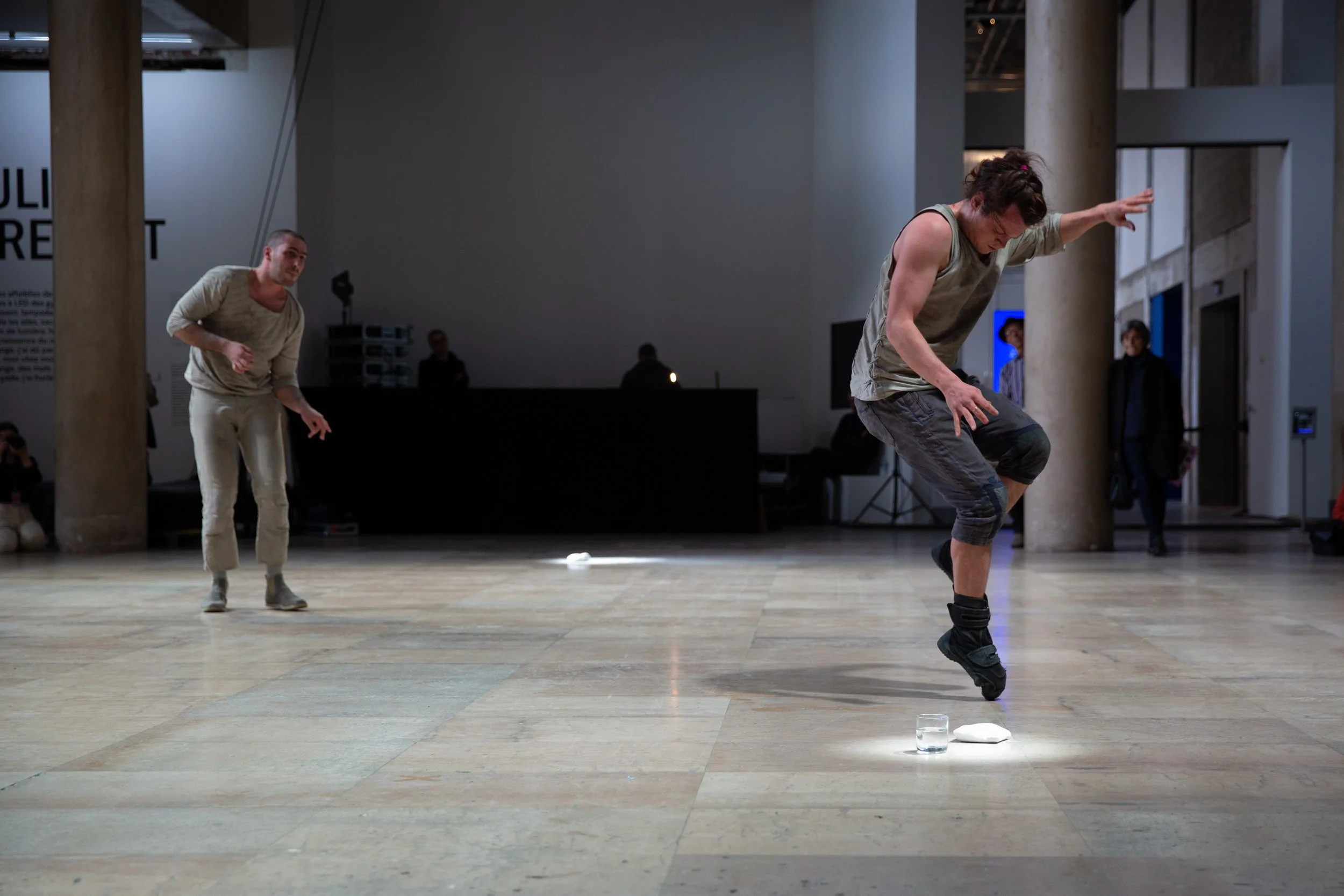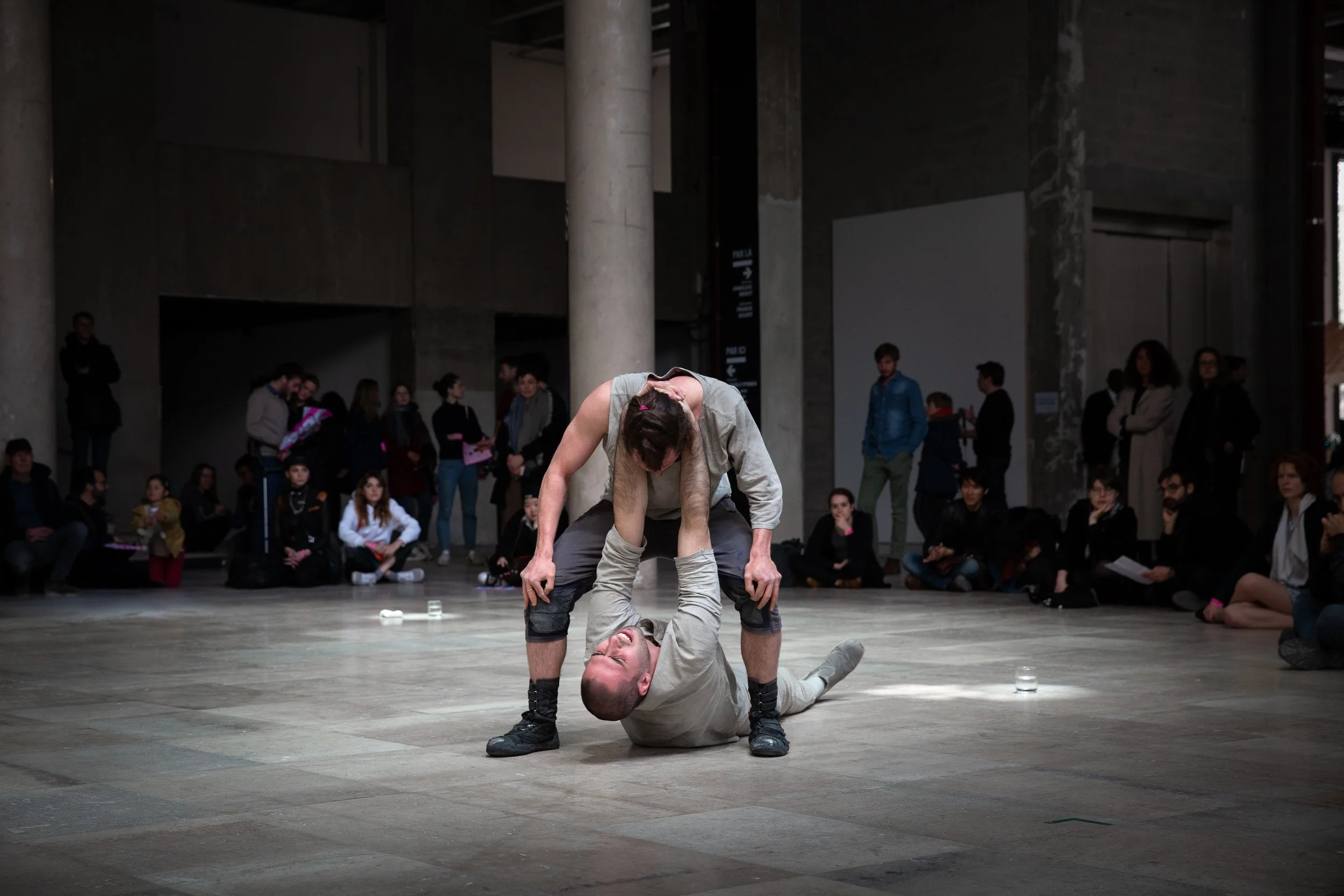 In Carriage, the two New Yorkers Matty Davis (artist and choreographer) and Ben Gould (multidisciplinary performer) explore empathy and control. Gould's controlled and uncontrolled movements combined with his raw energy drive this idea home. The evolving senses of the body – injury, trauma, healing and growth – form the foundation of their performance, drawn from their different physicalities. Empathy becomes a physical instrument, resistance gives stability. The piece has already been performed in the Palais de Tokyo in Paris, The Chicago Cultural Center, but also in a network of limestone caves and aboard a vessel on the Chicago River.