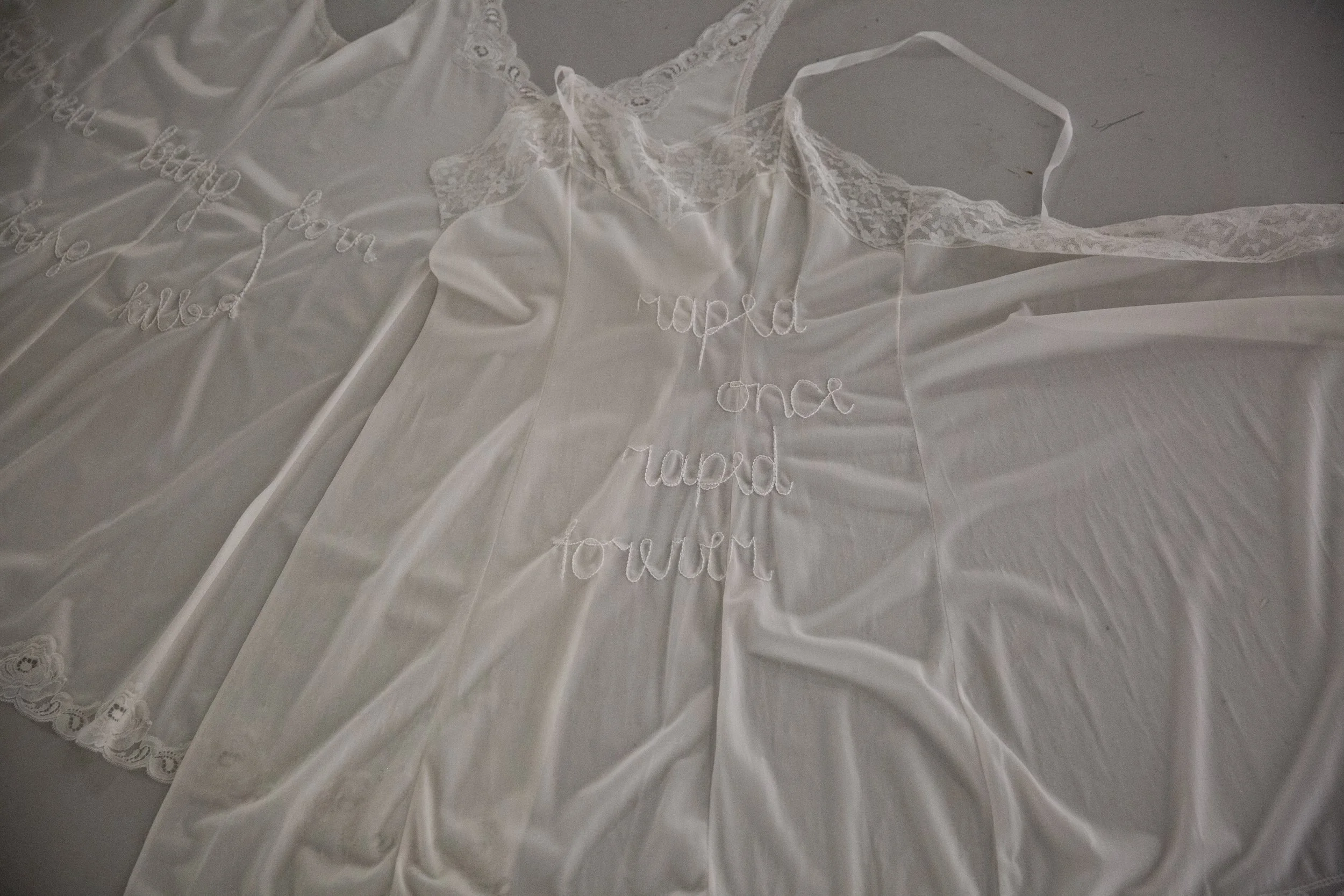 Mauvais rêve est une installation performative à propos d‘expériences traumatisantes, répétitives et transmises de génération en génération. La guerre en Ukraine, qui a commencé le 24 février 2022, a rouvert dans notre monde la plaie des précédentes batailles qui n'a toujours pas cicatrisé. Les robes de nuit pour femmes accrochées dans l'installation datent pour la plupart de l'époque de l'Union soviétique, mais elles portent des phrases brodées qui font référence à des événements actuels. Comme si rien n'avait jamais changé, l'histoire se répète comme un mauvais rêve.